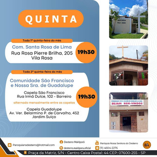 🗓️ QUINTA-FEIRA: Comunidade Santa Rosa de Lima e Comunidade São Francisco e Nossa Senhora de Guadalupe; ⛪
